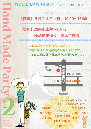 山口のお友達のみなさんが参加されるイベント、Hand Made Partyが、日曜日に行われます。