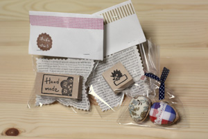 にじいろのたねのイベントで購入した、はりっちさんのバテンレースのHandmadeハンコを袋に押して、牛乳パック包みにしました。